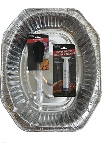 Disposable Durable Aluminum Foil Large Oval Roasting Pan Bundle With Turkey Baster And Turkey Injector Kit For The Holidays 3 Piece Set 17.5"x14"x3.5" Deep