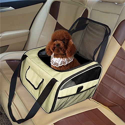 600 Denier Nylon shell extra softly padded. Interior tether is adjustable to keep your pet secure. Loops at back allows safety belt to go through and fix. Adjustable strap attaches to headrest or play as shoulder strap while walking. Handles are available for carrying. Zipper top/side for easy entry . Mesh top entry and side windows ensure air ventilation. ,br>Front and side pockets hold treat,toy,etc. 0