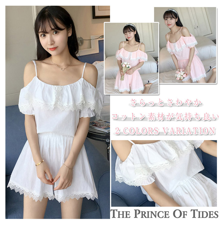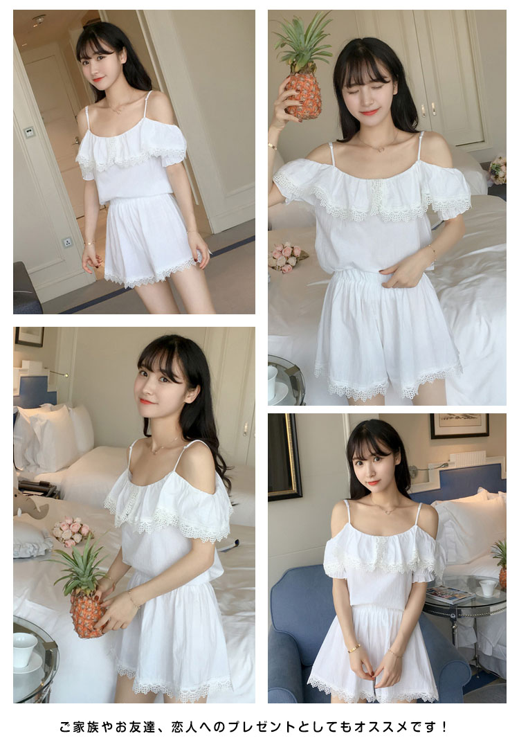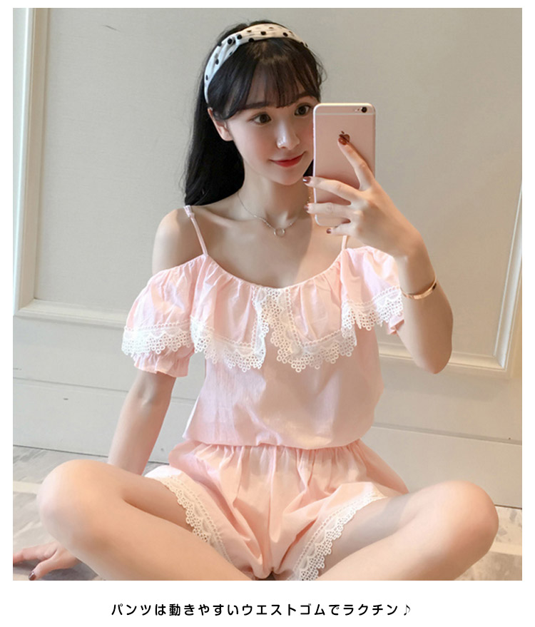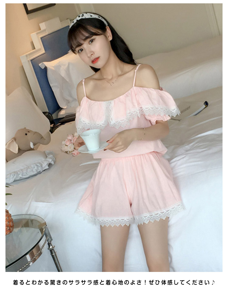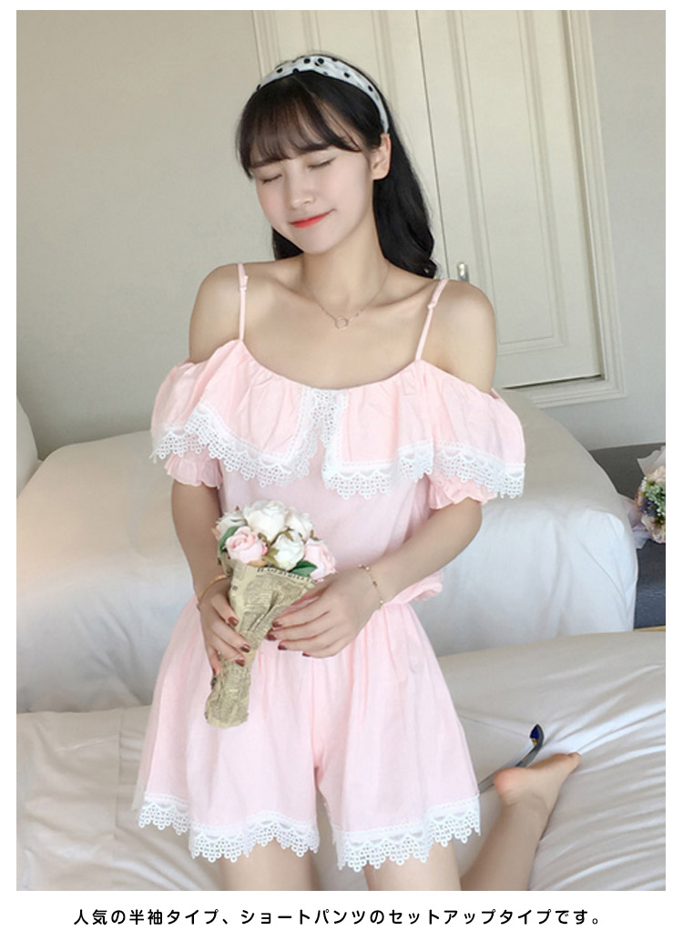 | さらっとさわやかコットン素材が気持ち良い。可愛いレース&オフショルダーデザインの半袖ルームウエアが登場!人気の半袖タイプ、ショートパンツのセットアップタイプです。パンツは動きやすいウエストゴムでラクチン♪着るとわかる驚きのサラサラ感と着心地のよさ!ぜひ体感してください♪家でも可愛くいられてゆったりできるオススメルームウエア♪ご家族やお友達、恋人へのプレゼントとしてもオススメです! | |