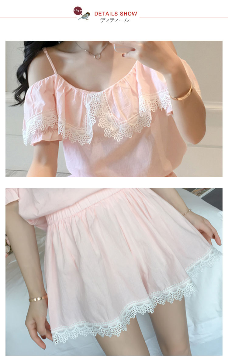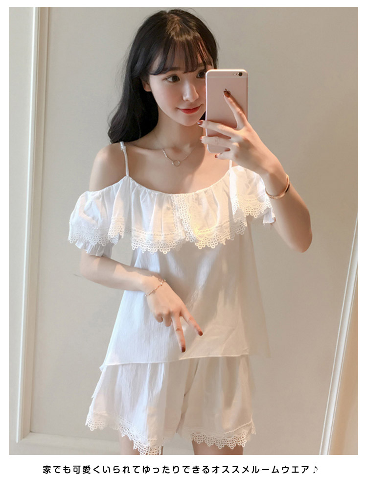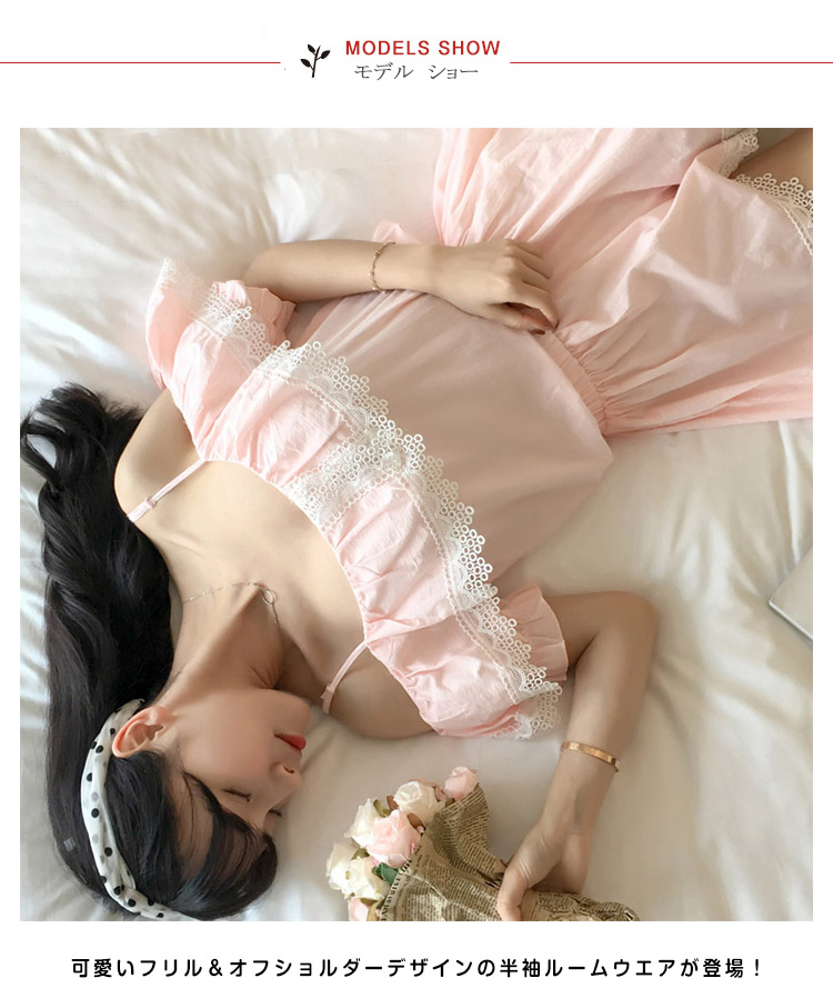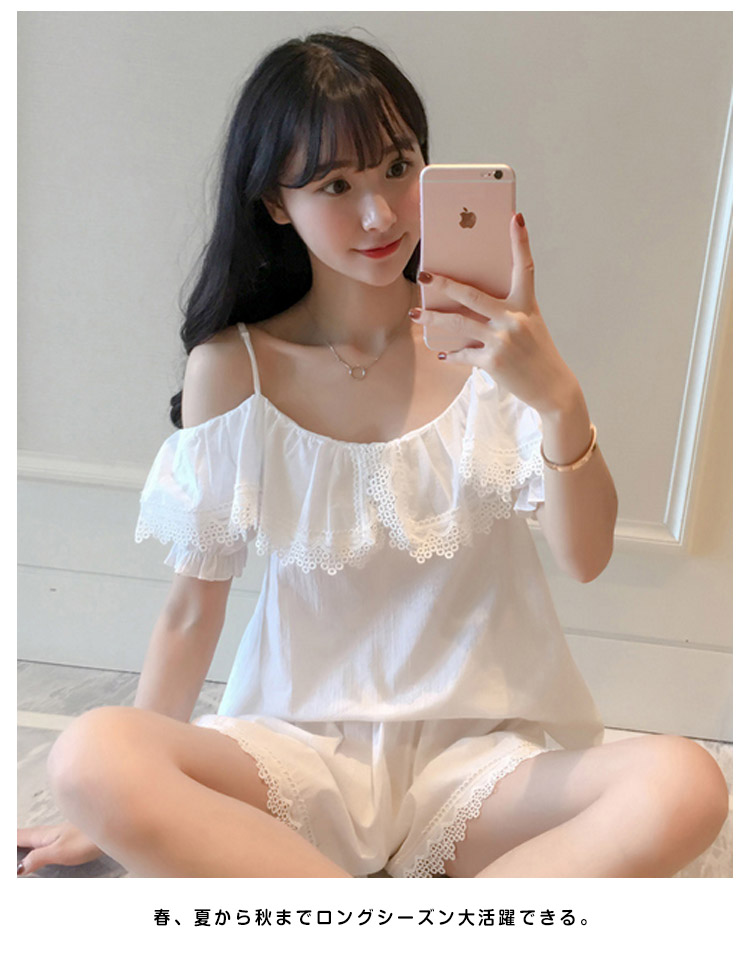 | さらっとさわやかコットン素材が気持ち良い。可愛いレース&オフショルダーデザインの半袖ルームウエアが登場!人気の半袖タイプ、ショートパンツのセットアップタイプです。パンツは動きやすいウエストゴムでラクチン♪着るとわかる驚きのサラサラ感と着心地のよさ!ぜひ体感してください♪家でも可愛くいられてゆったりできるオススメルームウエア♪ご家族やお友達、恋人へのプレゼントとしてもオススメです! | |