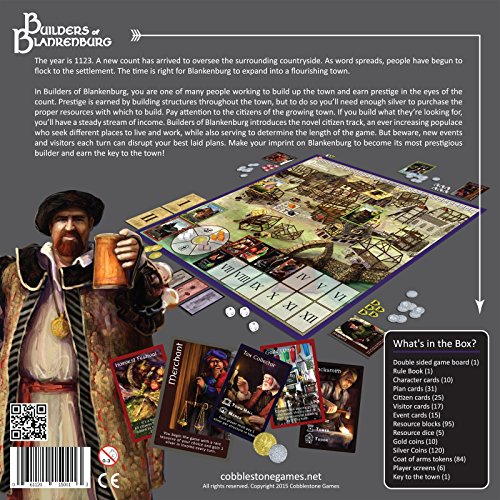 The year is 1123. A new count has arrived to oversee the surrounding countryside. As word spreads, people have begun to flock to the settlement. The time is right for Blankenburg to expand into a flourishing town. In Builders of Blankenburg, you are one of many people working to build up the town and earn prestige in the eyes of the count. Prestige is earned by building structures throughout the town, but to do so you’ll need enough silver to purchase the proper resources with which to build. Pay attention to the citizens of the growing town. If you build what they’re looking for, you’ll have a steady stream of income. Builders of Blankenburg introduces the novel citizen track, an ever increasing populace who seek different places to live and work, while also serving to determine the length of the game. But beware, new events and visitors each turn can disrupt your best laid plans. Make your imprint on Blankenburg to become its most prestigious builder and earn the key to the town!