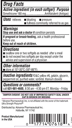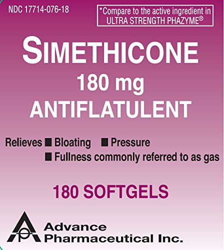 Studio : Advance Pharmaceutical Publisher : Advance Pharmaceutical Binding : Health and Beauty Product Description Count 180 Gelcaps per Bottle. Delivers ultra strength gas relief For pressure, bloating and gas discomfort They are small and easy to swallow Ultra Strength Relieves Gas Fast: Pressure Bloating Gas Discomfort Goes to Work in Minutes Contains a powerful ingredient, simethicone, the anti-gas medicine recommended most by physicians and pharmacists for relief of gas. Has the highest dose of simethicone available. Swallow one or two softgels as needed after a meal. Do not exceed two softgels per day except under the advice and supervision of a physician. Other information: Store at room temperature 59? - 86?F (15? - 30?C) Active Ingredients: Simethicone180 mg, Anti-gas 0