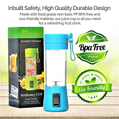 ? HotHomey Cup??is your unmarched quality personal usb juicer. Because we care for the environment, we worked hard with our suppliers to select the best material for this product. Hot Homey made with BPA free, eco-friendly and food grade material and takes as little as 60 seconds to mix a one serve protein shake or fruit blend.? Our blender comes with in-built safety feature to prevent unintended start which could result to injury. The Cup must be properly screwed to the base before your are able to start the unit. The blender also shuts down when over loaded to protect it from damage. If blender shuts down while in operation, reduce the load and start it again.? Our blender workes best for fruits chopped in cubes. While blending, shake blander for a much better experience. ? What is included: 1 Hot Homey USB Blender 1 Micro USB cable 1 English Instruction Manual ? Spacifications: Material ?Cup Cover - PP ?Cup Body - PC ?Cup Holder - ABS ?Seal Ring - Silicone Voltage: 3.6V; Battery Charge Time: 3 hours; Charge Source: USB (Cable included) Current: 10 - 12A No Load Speed: 22000rpm Full Load Speed: 15000rpm Cup Capacity: 380 ml We are always very proud of our product quality and that is why we offer you worry free purchase with our?100% Satisfaction Guarantee.?Yes! Our quality personal USB blender is backed by our manufacturer?30 days money back guarantee with 1 year free parts replacement. 0 |