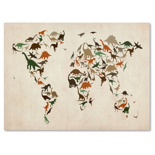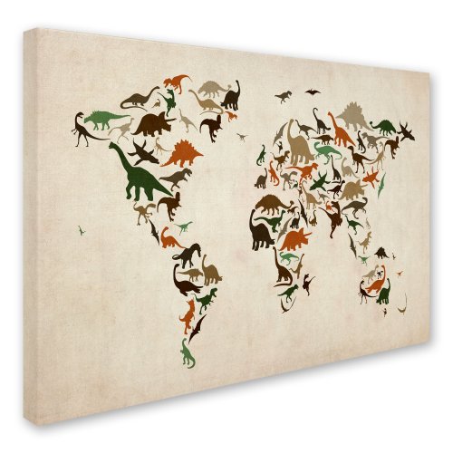 This ready to hang, gallery wrapped art piece features a world map of dinosaurs. Art and design were always Michael's favorite subjects at school. He was fortunate to land a job as a graphic designer at one of London's most prestigious publishing companies. After 12 years Michael Topsett made the decision to pursue a full-time career creating his own work. The freedom and time to be able to focus solely on his own projects has been a wonderful experience. Athrough Michael likes to experiment with different styles and subjects, hi main focus is on map art. He enjoys looking for unique and interesting ways to depict something which is very familiar. Maps are visual representations of the world we live in, a world which is incredibly diverse. Apart from maps, Tompsett creates urban landmark and cityscape designs. Giclee (jee-clay) is an advanced printmaking process for creating high quality fine art reproductions. The attainable excellence that Giclee printmaking affords makes the reproduction virtually indistinguishable from the original piece. The result is wide acceptance of Giclee by galleries, museums, and private collectors. Gallery wrap is a method of stretching an artist's canvas so that the canvas wraps around the sides and is secured a hidden, wooden frame. This method of stretching and preparing a canvas allows for a frameless presentation of the finished painting.Feature