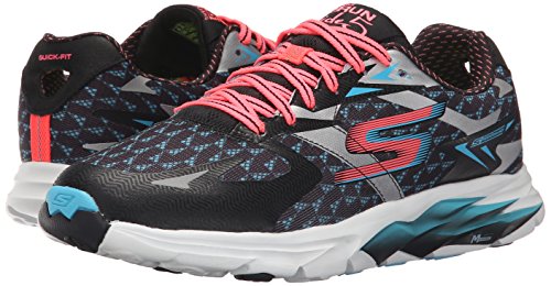 Lace-up running shoe featuring breathable upper in bold geometric pattern with padded tongue and collar