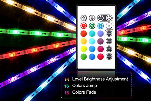 【Multiple Color Options】LED color changing light strip: 16 colors and 4 dynamic play modes, dimmable.Controlled by IR Remote within 8-10m