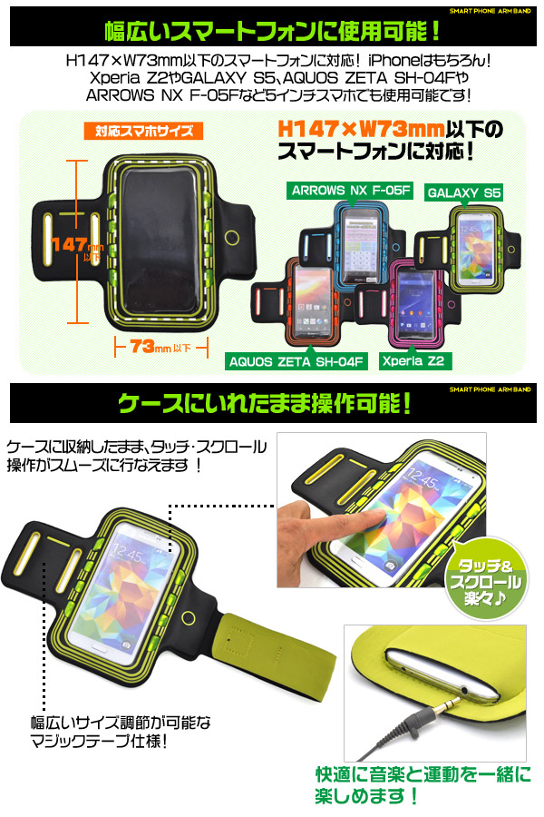 H147×W73mm以下のスマートフォンに対応! iPhoneはもちろん! Xperia Z2やGALAXY S5、AQUOS ZETA SH-04FやARROWS NX F-05Fなど5インチスマホでも使用可能です!