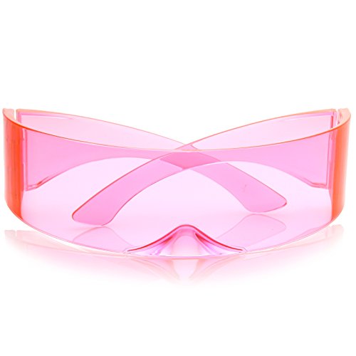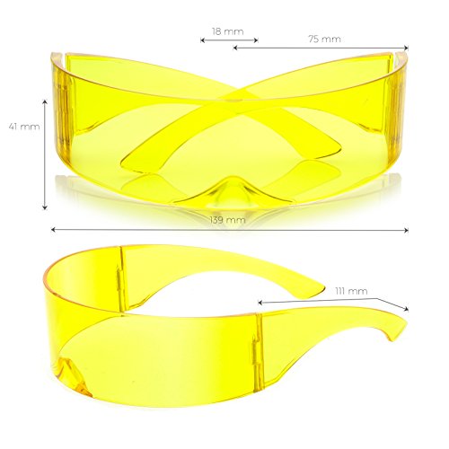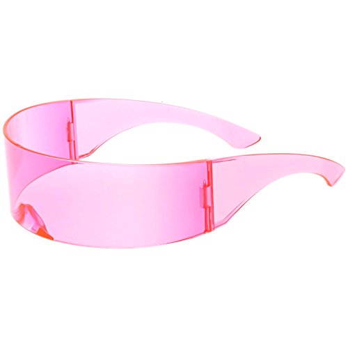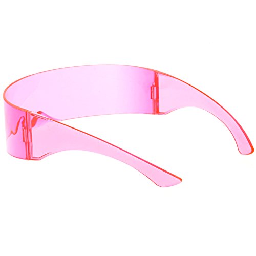 DetailsCreate an out of this world look with these futuristic shield sunglasses featuring a curved mono lens in fun color tinted hues. Compelte with stylishly wide arms, these bold sunglases will add a pop of color to your costumes and photobooth pictures. Made with a plastic based frame, double barrel hinges, and 100% UV protected lenses.
