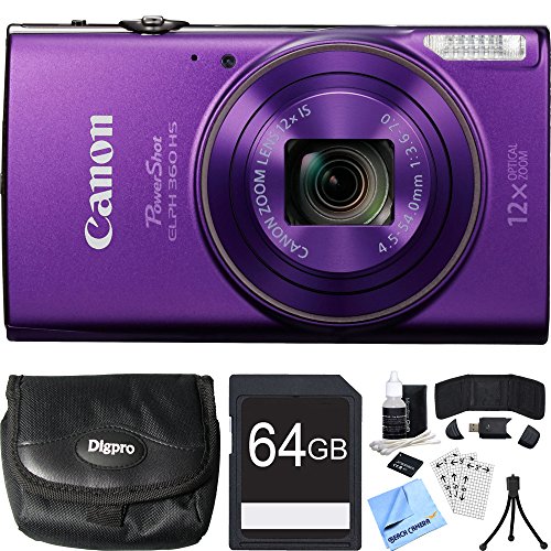 Canon PowerShot ELPH 360 HS Purple Digital Camera 64GB Card Bundle includes Camera, 64GB Memory Card, Reader, Wallet, Case, Battery, Mini Tripod, Screen Protectors, Cleaning Kit and Beach Camera Cloth