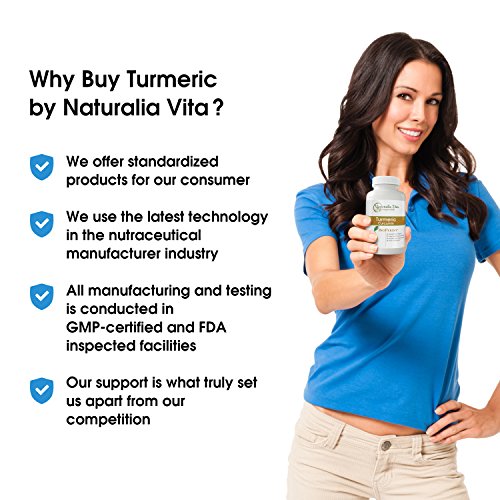 -. Feature : UNLIKE OTHER LOW-QUALITY TURMERIC SUPPLEMENTS that may cause stomach issues, smell horribly or often have no real effect, the Naturalia Vita organic and approved turmeric curcumin capsules will help support your health and diet! / OUR FAST-ACTING & NUTRIENT RICH FORMULA will start working immediately in order to help support joint health, help reduce inflammation and assist in the reduction of stiffness. As a result, you will start feeling more confident, energized and productive every single day! / WITH BIOPERINE in each pill, you can rest assured that our organic turmeric supplement will ensure less joint pain. / SPEED UP NUTRIENT ABSORPTION with our premium turmeric curcumin veggie capsules, which contain 5mg of highly potent BioPerine, which acts as a catalyst and turbo-charges the absorption levels in order to maximize the effect of curcuma longa on your body! / GLUTEN FREE, VEGETARIAN, VEGAN FRIENDLY FORMULA: Also Non GMO, Sugar Free dietary supplement will effectively support men and women health!