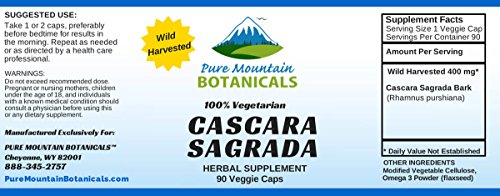 -. Feature : Our Cascara Sagrada Bark is Ethically Wild Harvested and then Aged to provide Natural and Safe Intestinal Support* / Each capsule contains 400mg of Aged Cascara Sagrada Bark / Our CASCARA SAGRADA is VEGETARIAN, KOSHER and GLUTEN FREE. Feel Secure Knowing You're Only Putting the Absolute Best Product in Your Body, Made with NO Harsh Preservatives, Fillers or Flowing Agents - NO Sodium Benzoate, NO Magnesium Stearate, NO GMOs / Cascara Sagrada bark whose name translates to "sacred bark", has a long history of use as a Natural Herbal Laxative.* / 100% MANUFACTURE'S MONEY BACK GUARANTEE - Try the Best - Risk Free! This CASCARA SAGRADA and ALL Products from Pure Mountain Botanicals™ are covered by a no-questions asked money back guarantee.