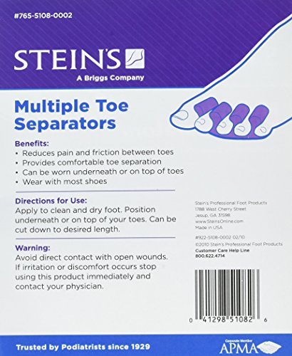 ReleaseDate : 2016-11-14 Studio : MABIS/DMI Healthcare Publisher : MABIS/DMI Healthcare Binding : Health and Beauty Product Description Keep your feet happy and healthy by using the highest quality foot-care products. One of the most trusted names in foot care, Stein's has been the authority in podiatric padding and supplies since 1929. Try our products and you'll see why Stein's has been the leading manufacturer of professional grade foot-care products for over 80 years. These versatile multiple toe separators will be a nice addition to any home, doctor's office or podiatrist's office. They can be used as an auxiliary device for X-ray examinations. They enhance comfort by keeping shoe pressure off your dorsal areas. 0