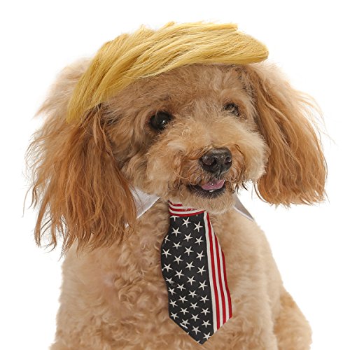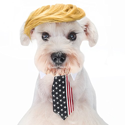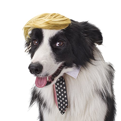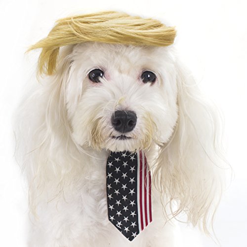 -. Feature : Dog wig & stars stripes style USA flag elements necktie, cosplay different sensation / Make Animal Great Again! Dressed as the trademarks hair of a real estate developer or political figures, attract most of attention / Easy fit - Elastic band and velcro can be also supported other accessories. / Adjust necktie length with velcro. Elastic band strap connect to necktie and ALWAYS keep in the middle of chin / Suitable for Halloween, Christmas, Easter, Parades, Carnival, holidays, parties, activities, festivals, dress up, photo shoot, pranks and gag gift