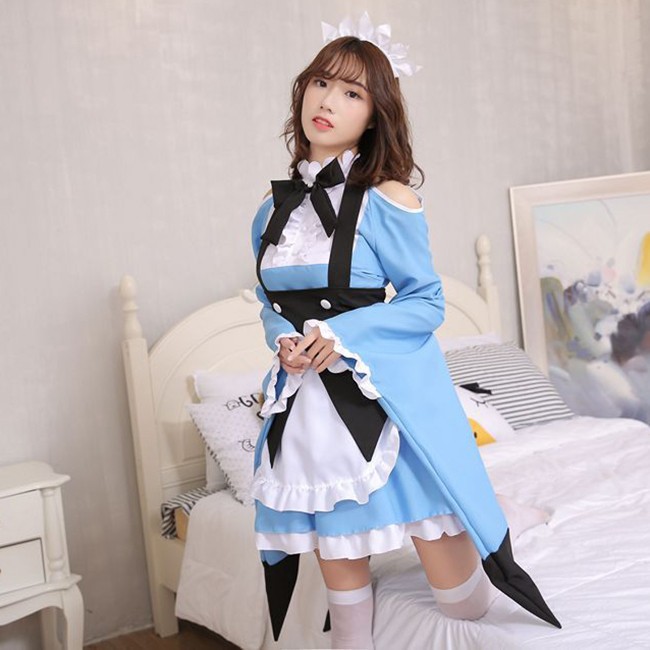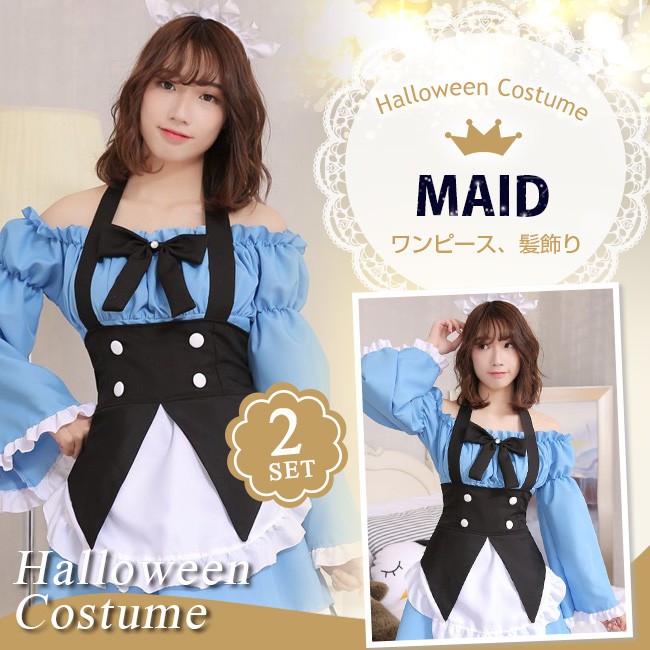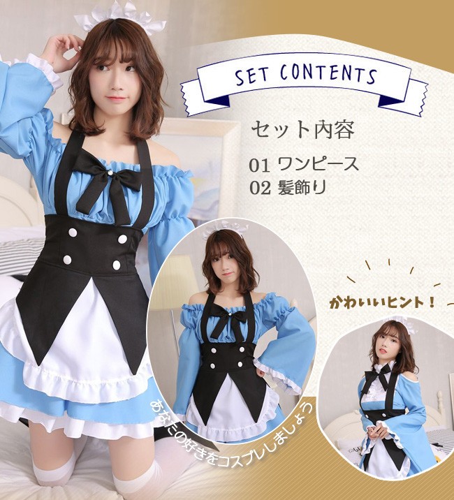 クリスマス コスプレ レディース セクシー メイド服 長袖 オフショルダー ブルー 2タイプ コスチューム 衣装 かわいい 仮装 変装 大人 服 セットアップ パーティーグッズ イベント用品 余興 xmas Christmas cos 女性用