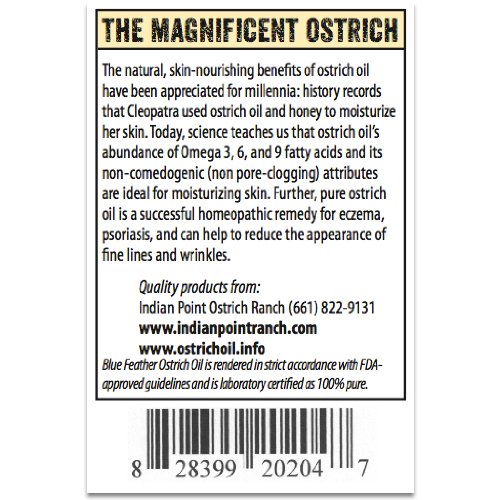 -. Feature : 100% Pure Ostrich Oil, 4 oz. / Use for all skin types, providing severely dry skin the best results. / All natural, absorbs quickly, leaves no oily residue. / Completely sourced and made in the USA. / HOW DO OSTRICH OIL AND OIL DIFFER? Ostrich oil and oil are virtually identical in properties and both achieve the same wonderful results. Ostrich Oil, however, has a higher content of Omega 3, 6, and 9 than oil. These omega oils cause the Ostrich to have the most powerful immune system of any land animal. Ostrich Oil also has a smaller molecular makeup than oil making it transdermal, meaning it can penetrate deeper into the skin giving you better results. There is also a difference in the quality of the products: most oil products are commercial formulas that contain a high amount of chemicals and paraben preservatives (not to mention peroxide). Our Ostrich Oil is 100% pure, all-natural oil and of the highest quality and made in the USA!