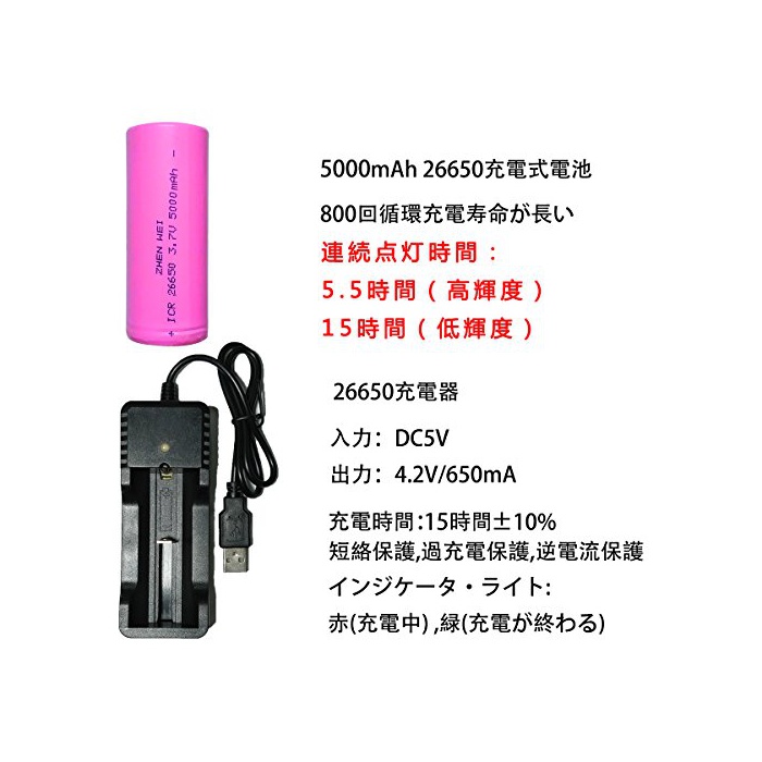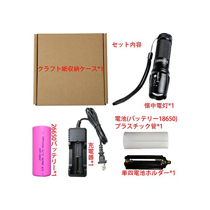5,세트 내용:회중전등X1,배터리26650충전기X1,26650배터리X1,단4배터리 홀더X1,크래프트지 수납 케이스X1,전지(배터리26650)플라스틱관X1.만전의 애프터 서포트:본 제품은 구입 일부터18개월간의 보증 (이)가 있습니다. 제품에 어떠한 이상이 있으면,사양 말고 부담없이 문의 하십시오.보증:구입 일부터30일간의 환불&12개월의 안심 보증이 첨부 됩니다.