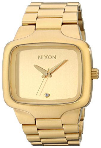 [Description] Rectangular-square watch featuring solid-tone minimal dial with petite diamond hour marker at 6 o``clock 44mm stainless steel case with mineral dial window Japanese quartz movement with analog display Three-link stainless steel band featuring fold-over clasp with single push-button safety Water resistant to 100 m (330 ft): In general_ suitable for swimming and snorkeling_ but not scuba diving.