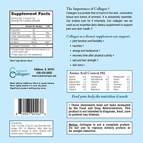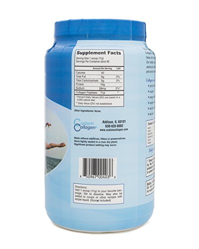 -. Binding : Health and Beauty -. Brand : Custom Collagen -. Department : Gelatins -. EAN : 0858789002025 -. Feature : Commonly used for joint pain, hair and nail strength, and skin tone! / Raw material is source from pasture-raised, South American cattle / Use this as an alternative to soy or whey protein. Each scoop contains 10 grams of protien! / Commonly used for illnesses such as leaky gut syndrome, celiac disease, and hashimotos / This is produced by Custom Collagen - a Family owned and operated gelatin manufacturer with over 40 years of experience -. Label : Custom Collagen -. Manufacturer : Custom Collagen -. PackageQuantity : 1 -. ProductGroup : Health and Beauty -. ProductTypeName : HEALTH_PERSONAL_CARE -. Publisher : Custom Collagen -. Studio : Custom Collagen -. Title : Custom Collagen's Hydrolyzed Gelatin | Collagen Peptides 2lb (32oz) Jar - Pasture Raised Cattle - Kosher - Unflavored Powder -. UPC : 850967004036