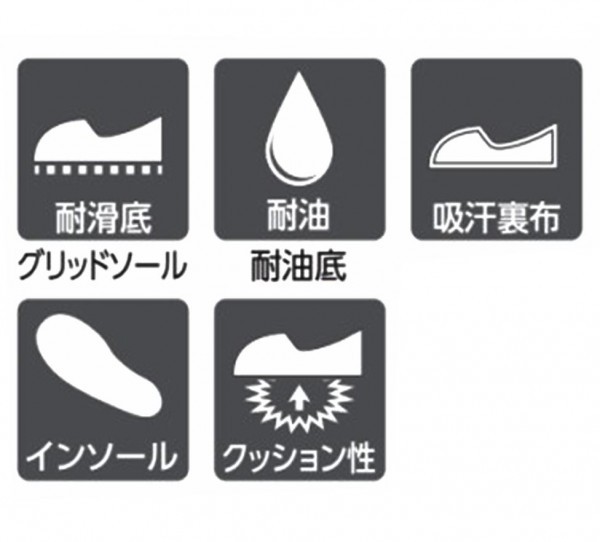 すべりにくく油に強いスニーカータイプ。クッション性にも優れた疲れにくい厨房靴です。