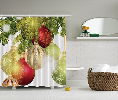 Red Gold & Green Holiday Ornaments in Christmas Tree Fabric Shower Curtain