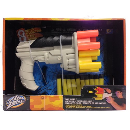 -. Binding : Toy -. Brand : Toys R Us -. EAN : 0803516286667 -. Feature : Air Zone Over Under Dart Blaster / Holds 8 Darts / Blasts rapid-fire up to 25 feet / The curved handle provides an easy and comfortable grip. / Single-handed, automatic rapid fire action -. Label : Toys R Us -. Manufacturer : Toys R Us -. Model : 5F61D2A -. MPN : 5F61D2A -. PackageQuantity : 1 -. PartNumber : 5F61D2A -. ProductGroup : Toy -. ProductTypeName : TOYS_AND_GAMES -. Publisher : Toys R Us -. Studio : Toys R Us -. Title : Air Zone Over Under Dart Blaster -. UPC : 803516286667