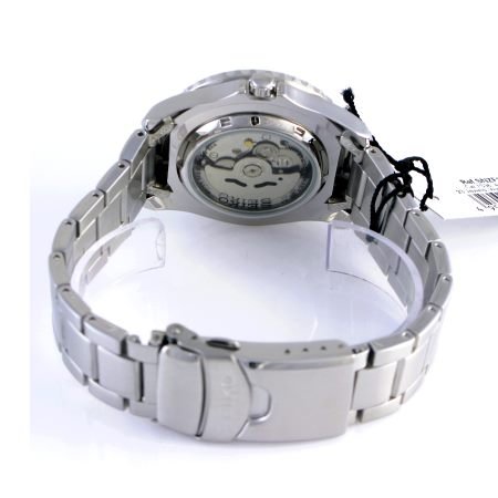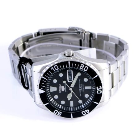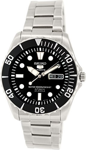 Studio : Seiko Publisher : Seiko Binding : Watch Product Description Stainless steel case with a stainless steel bracelet. Uni-directional rotating stainless steel bezel. Black dial with luminous hands and index hour markers. Minute markers around the outer rim. Dial Type: Analog. Day of the week and date display at the position. Automatic movement. Scratch resistant Hardlex crystal. Skeleton case back. Case diameter: 44 mm. Case thickness: 13 mm. Round case shape. Fold over clasp with safety release. Water resistant at 100 meters / 330 feet. Functions: date, day, hour, minute, second. Casual watch design. Seiko 5 Black Dial Stainless Steel Automatic Mens Watch SNZF17. 0