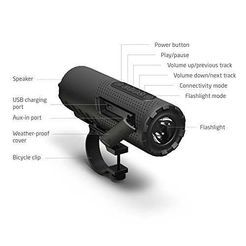 Feature : ENJOY RIDING, SAFELY - A front bicycle light helps create a safer, bright riding path in low light, while the built-in Bluetooth speaker helps you stay motivated as you pump out your favorite tunes with each pedal! / MULTIPLE LIGHT MODES - With just a single touch of a button you can switch between an "always on" high beam or strobing flash. This helps ensure you stay safe in the dark and can be seen by passing cars or pedestrians. / TAKE MUSIC EVERYWHERE - Built into the front-mounted light is also a wireless Bluetooth speaker that lets you listen to your favorite music via your iPhone 7, Samsung Galaxy 7, iPod, MP3 player, smartphone or mobile device. / ENHANCED DURABILITY - This LED light/Bluetooth combo is weather resistant, water resistant and shock proof, so you never have to worry about riding in inclement weather or going off road! / EASY INSTALLATION - Every bike light and speaker comes with a universal mounting bracket that makes is simple and easy to mount to your bicycle frame. Simply slide is over the handlebars, screw it down, and off you go.