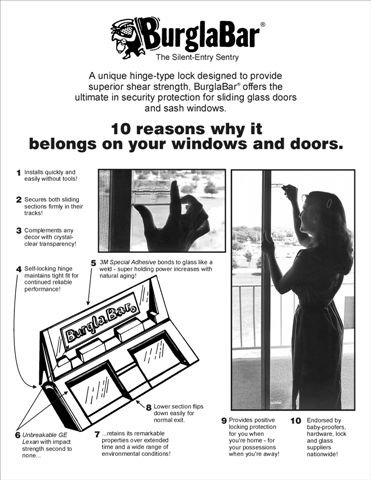 -. Binding : Misc. -. Brand : Rishon EnterP.R.Ises Inc. -. Color : Clear -. EAN : 0872246001062 -. Feature : Installs quickly and easily without any tools securing both sliding sections. / Self-Locking hinge maitains tight fit for continued reliable performance. / Provides additional security for you when you are home or away. / Provides additional protection for your belongings when you are away. / Made of LEXAN and a special 3M adhesive that bonds like a weld. -. Label : Rishon EnterP.R.Ises Inc. -. Manufacturer : Rishon EnterP.R.Ises Inc. -. Model : RE 1015 -. MPN : RE 1002 -. NumberOfItems : 1 -. PackageQuantity : 1 -. PartNumber : RE 1002 -. ProductGroup : Home Improvement -. ProductTypeName : HOME_LIGHTING_ACCESSORY -. Publisher : Rishon EnterP.R.Ises Inc. -. Studio : Rishon EnterP.R.Ises Inc. -. Title : Burglabar 2 Pack -. UPC : 872246001062