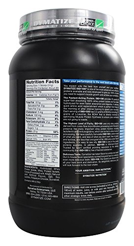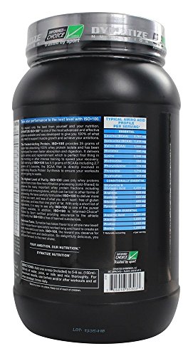 Take your performance to the next level with ISObull100. You expect only the best from yourself and your nutrition. DYMATIZE ISObull100reg is one of the most advanced and effective proteins available and was developed to give you 100 of what you need to support muscle growth and achieve your ambitions. The Fastest-Acting Protein. ISObull100 provides 25 grams of super-fast absorbing 100 whey protein isolate and has been hydrolyzed for even faster absorption and digestion. It delivers quick amino acid replenishment which is perfect first thing in the morning or after intense training to speed your recovery. Each serving of ISObull100 has 5.5 grams of BCAAs including 2.7 grams of L-Leucine, the BCAA that is directly involved in optimizing Muscle Protein Synthesis to ensure your workouts are not going to waste. The Highest Level of Purity. ISObull100 uses only whey proteins derived from cross-flow microfiltration processing cold-filtered to preserve the many important whey protein fractions including lactoferrin and immunoglobins, which can be lost in other forms of processing. We have carefully formulated ISObull100 to deliver more of what you want, and less of what you donrsquot want free of gluten and lactose, and less than one gram of fat. With only a short list of ingredients, it is easy to see why ISObull100 is one of the purest proteins available. In addition, ISObull100 is Informed-Choicereg Trusted by Sport certified providing assurance to the athletic community that ISObull100 is free of banned substances. Delicious Taste. Dymatize has taken flavor to a whole new level Our in-house flavor specialists worked long and hard to create an even more delicious taste. ISObull100, the reward you deserve for all your hard work and dedication. So delightfully delicious, you will look forward to the next shake.Feature