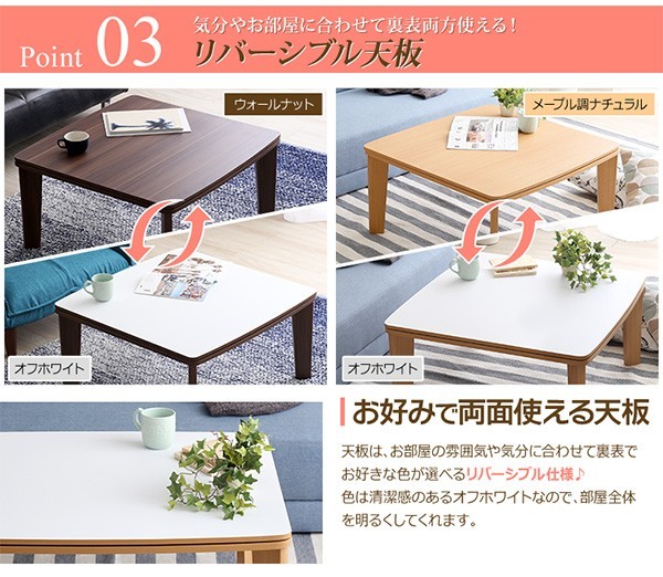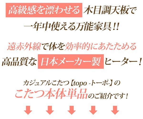 カジュアルこたつ【topo-トーポ-】正方形タイプ(70×70cm幅) ![]() ホワイトカジュアルこたつ【soneca-ソネカ-】正方形タイプ(70×70cm幅)はこちら ![]() カジュアルこたつ【topo-トーポ-】丸型タイプ(直径80cm)はこちら ![]() |