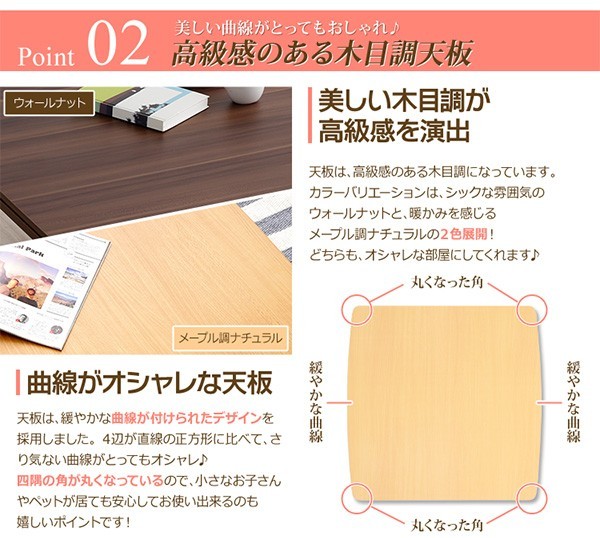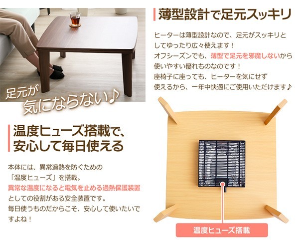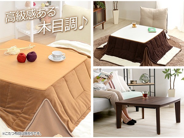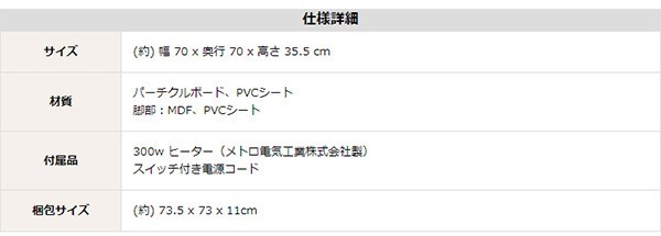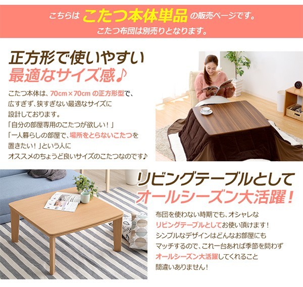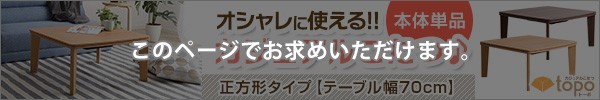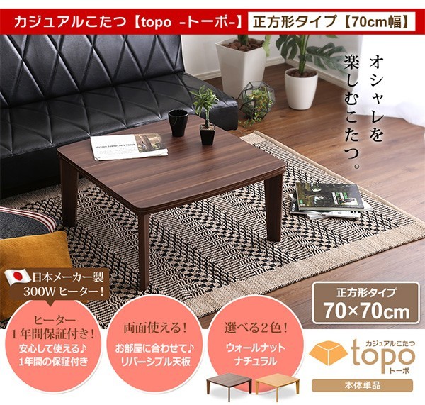 【商品について】カジュアルこたつ【-Topo-トーポ(正方形・70cm幅)】(こたつ 70)■サイズ:本体外寸:(約)幅70x奥行70x高さ35.5cm本体:(約)11.74kg■カラー:本体:ウォールナット、ナチュラル■素材:天板:パーチクルボード、PVCシート脚:MDF、PVCシート※付属品:300Wヒーター(メトロ電気工業株式会社製)・無段階温度調節機能、温度ヒューズ付・スイッチ付き電源コード■その他:・完成品でお届けします。※脚はお客様取付け本体:(約)73.5x73x11cm本体:(約)12.6kg