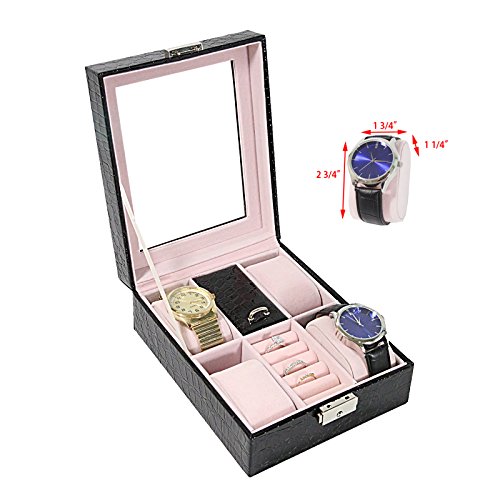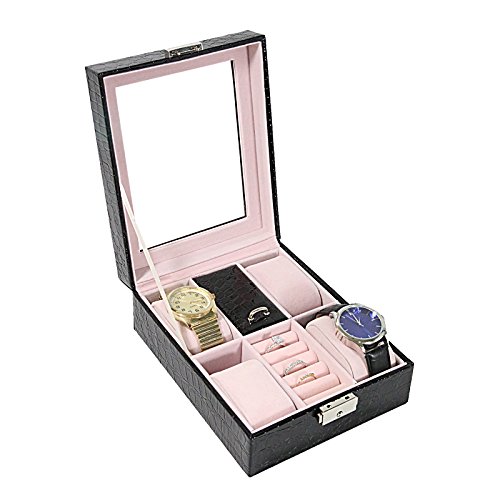 -. Feature : All in one solution to keep various kinds of jewelry, such as watches and rings, organized and dust free! / Soft cushioning suede leather interior that keeps your jewelry away from damage / Transparent window allows for a quick and convenient view of all your jewelry at a glance / Exterior Color: Black, Material: PU Leather, Velvet, Finish: Crocodile Texture Finish, Box Size: 8.25¡¨ x 6.25¡¨ x 3¡¨, Fits: Up to 4 watches, Up to 5 rings, and 1 extra compartment for miscellaneous jewelry / All NuLink products GUARANTEE defect free/ damaged & come with 1 Year warranty. Message us if you have any problems