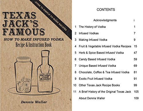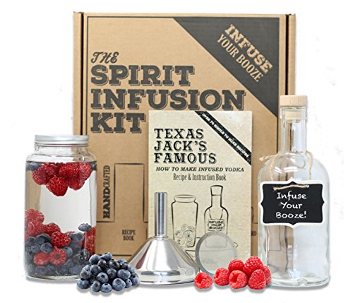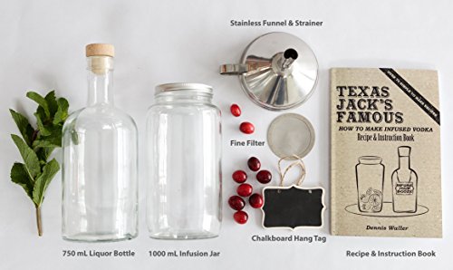 - COMPONENTS, RECIPES & INSTRUCTIONS INCLUDED! Kit features Texas Jack's "How to Make Infused Vodka" book. Includes fun and easy to follow instructions and over 70 simple to make artisan recipes such as: Pomegranate, Pineapple Coconut, Orange, Spiced Apple Cinnamon, Cucumber and even Bacon Flavored Vodka! Great for Bloody Marys, Martinis, Cosmopolitans, Screwdrivers, Long Islands, White/Black Russians & Alcoholic Punch. Same concept applies to flavoring gin, whiskey, bourbon and rum.