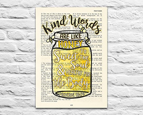 This 5x7 UNFRAMED reproduction print of a highlighted King James Bible scripture is sure to bring encouragement or hope to someone. We scan real pages from old Bibles (thus they have slight flaws and aging such as bleeding words from the other side, because the pages are so thin), which just adds to the character. The highlighted Bible page is in the King James version: "Pleasant words are as an honeycomb, sweet to the soul, and health to the bones."