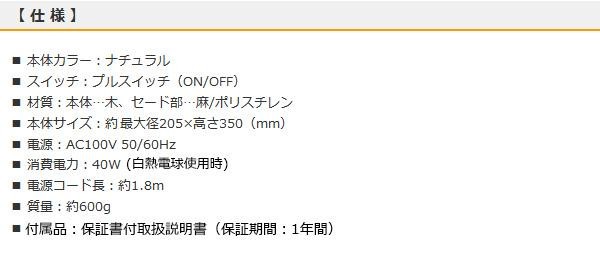 fk094igrjs木製のぬくもりある質感とシンプルなフォルムが、お部屋を落ち着きのある空間に演出します麻(外側のみ)のセードから、光がやわらかく広がります サイズ 個装サイズ:22×22×37cm 重量 個装重量:710g 製造国 中国 プルスイッチの懐かしいデザイン ※電球は別売です(使用電球/全長:120mm・最大径:60mm以下、口金:E26) 以下の指定以外の電球、特殊電球は使用しないでください 発火、発煙、火災の原因となります 【白熱電球】 40W以下を使用してください 【電球形蛍光灯】 10W以下を使用してください 【LED電球】 8W以下、質量110g以下を使用してください ※LED電球を使用する場合、広配光のタイプをお勧めします 木製のぬくもりある質感とシンプルなフォルムが、お部屋を落ち着きのある空間に演出します麻(外側のみ)のセードから、光がやわらかく広がります ご注文後3~4営業日後の出荷となります