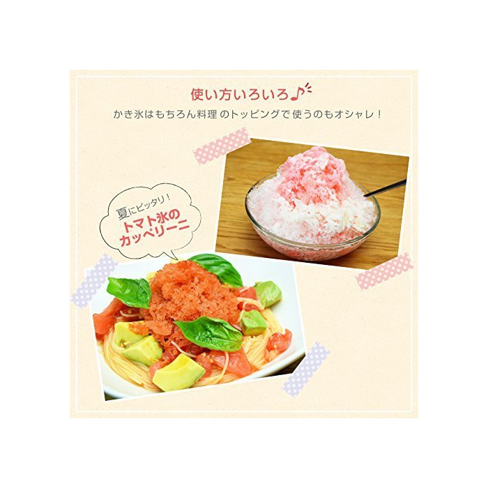 사용하는 얼음을 어레인지 해 여러가지 요리를 만드는 일이 가능.예를 들면,연유를 섞은 얼음을 만들기,둥실둥실 모드에 깎으면 달콤하고 부드러운 먹을 때의 느낌의 대만풍 빙수가 완성.토마토 쥬스를 얼게 해 파스타에 깎아 뿌리면,더운 하에 꼭 맞는 냉제 토마토빙의 카《페리니》에.글래스에《샤리샤리》의 빙수를 만들어 넣음(담는 그릇·상자 등),좋아하는 술을 쏟아지면 멋진 칵테일을 즐기는 것 를 할 수 있습니다.