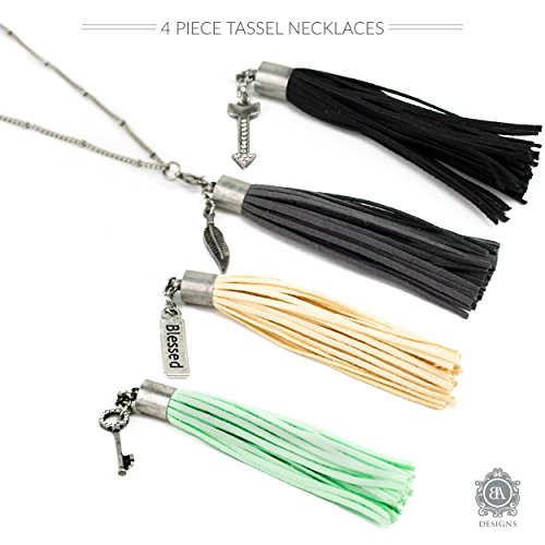 -. Feature : INTERCHANGEABLE TASSELS TO STYLE WITH ANY OUTFIT. With your four different colors to chose from, you can dress these up for a night out on the town or dress them casual for your everyday. The strong lobster claw clasp allows you change them out easily to match your day. / EXCLUSIVELY DESIGNED WITH UNIQUE COLORS & CHARMS. With your trendy new tassel necklace, you get four for the P.R.Ice of one. It includes a lovely 30" antique silver chain with a 2" extender, a durable lobster claw clasp and four suede tassels (onyx black, mint green, classic ivory, stone grey) with custom charms in a ready to use gift box. / ENHANCE YOUR NECKLACE WITH ESSENTIAL OILS. If you have not experienced the benefits of essential oils, these necklaces are versatile to allow you to take your favorite scent with you on the go. Simply add a few drops of your favorite essential oils to the tassel. Not an oil user, no worries - just wear them for their cute style.
