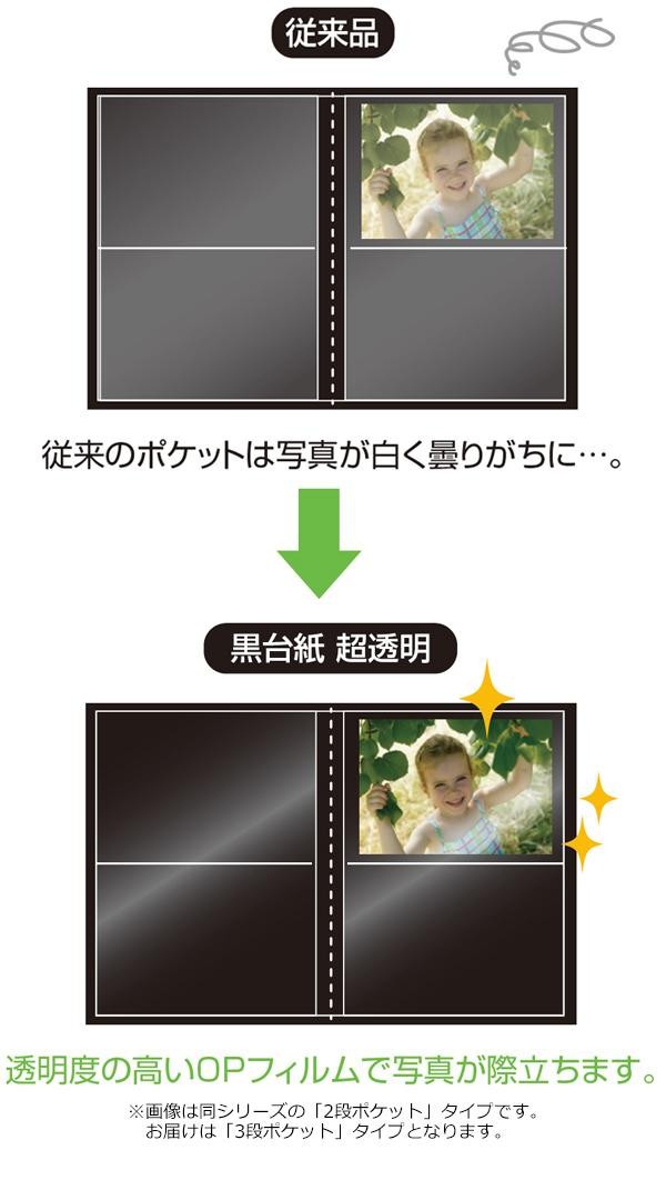 | 写真の美しさを際立たせる透明度の高いフィルムを使用した超透明ポケットアルバムです。写真が映える黒台紙を採用しているので、こだわりの写真の収納に最適です。 |