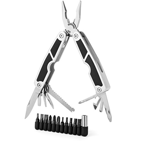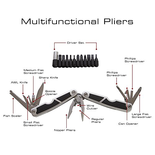 ULTIMATE MULTIFUNCTION TOOL: Conveniently and safely store in a shealth with belt loop. The multipurpose tool features include pliers, knife, can opener, saw, medium flat, wire cutters, nipper pliers, and all standard phillip, flat and allen wrench set.
