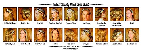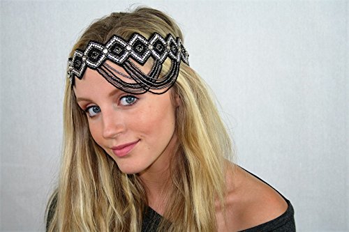 This Great Gatsby Rhinestone headband features round faceted rhinestones encompassed by surrounding rhinestone embellishments along the band and larger stones in the middle. Hanging beaded accents give a roaring 1920's style headband look. Great for that Gatsby Party, flapper, or to wear with any outfit. Can be worn in short, med, or long hair. With all its glitz and glamour these unique headbands are backed by a high quality velvet so your hair does not catch while styled. Comes with a style guide so you can choose your style. Rhinestone headbands are fun, edgy, and pairs great to accentuate any outfit. Wear the headbands in a range of looks to compliment any type of hair. These are the new accessory to go with everything. Headbands are constructed with an elastic stretch band for a secure fit and are easy and comfortable to wear. Decorative portion measures 13.5 inches long 1.5 inches wide. back of headband is a black stretch cord one size fits all. Look Sheet Guide comes with to show multiple ways to wear the headband for the Great Gatsby looks, holiday season, or all year. Wonderful Accessory For a Great Gatsby Party!!Feature
