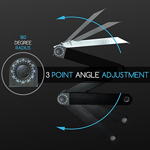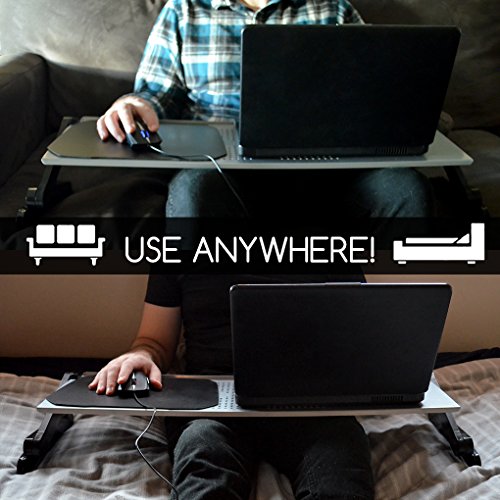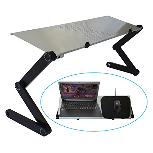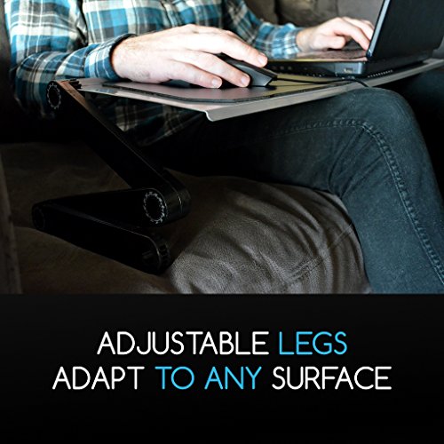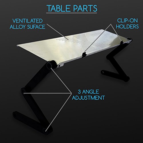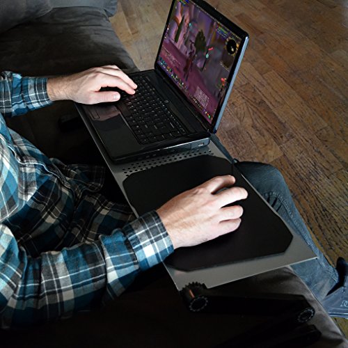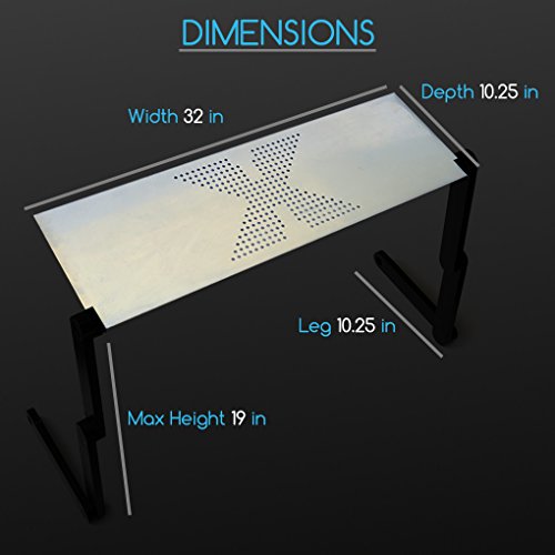 -. Feature : 3 point adjustable height and angle for using on many surfaces / Easy to adjust with no tools, 1-touch button joints allow you to adjust height and angle / Vented surface keeps your laptop at optimum temperatures / Durable alloy surface design is stylish and strong / Fits up to 17inch laptops. Surface dimensions 32W x 10.25D inches, max height 10.25 inches
