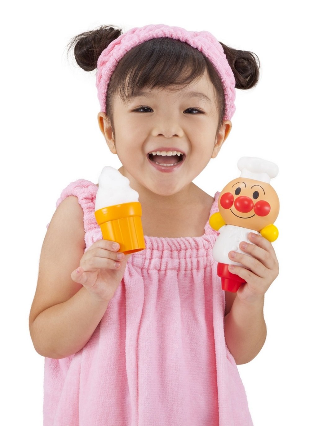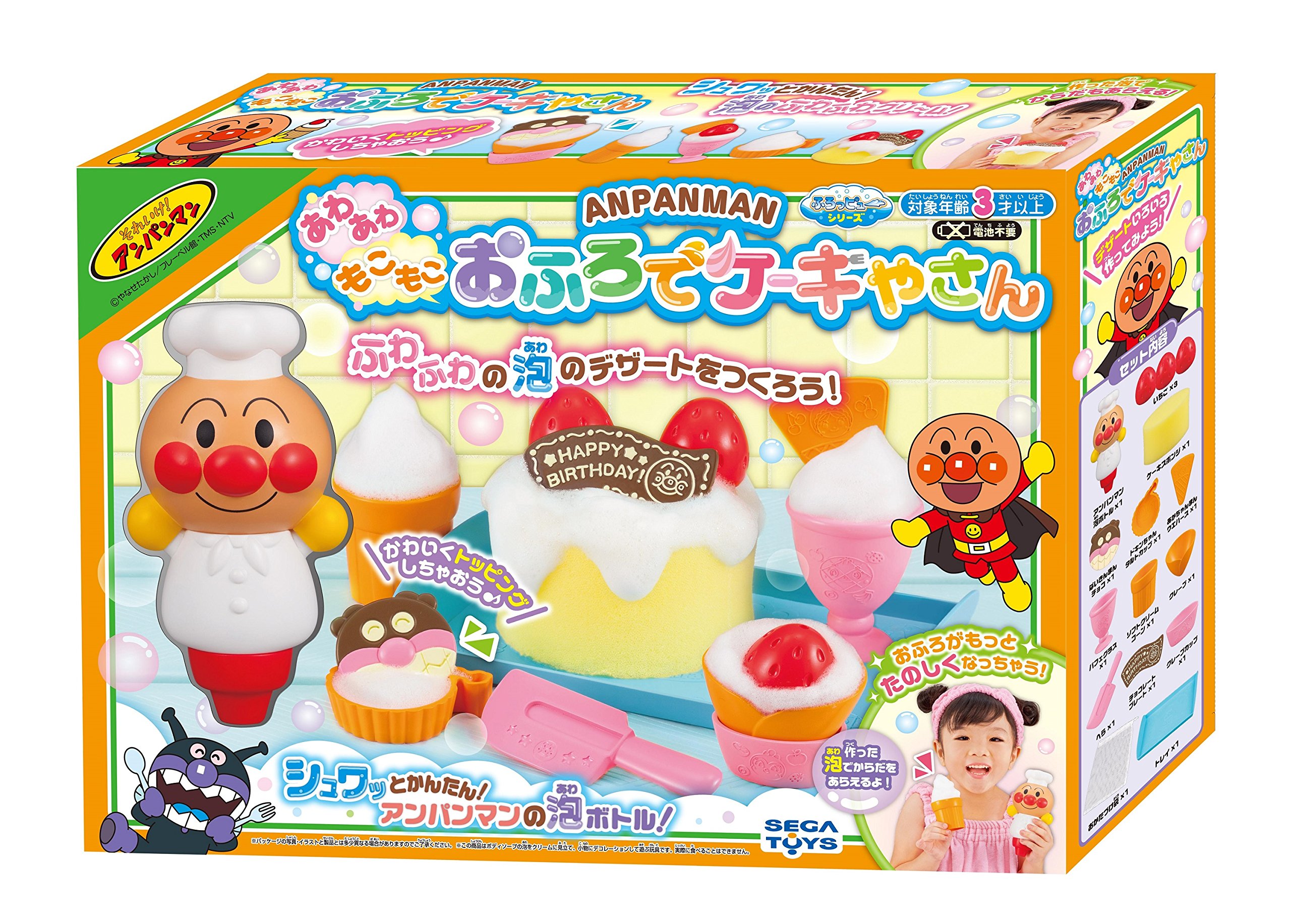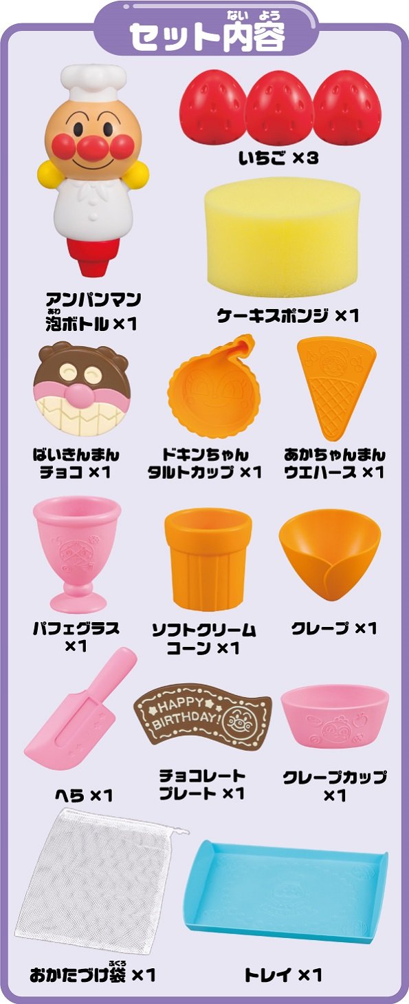Let's play a cake shop together with anpanman at a bath! Just by putting a bottle liquid soap for commercial bubbles in Anpanman's foam bottle and holding it, the fluffy foam will come out as well.