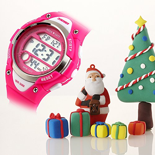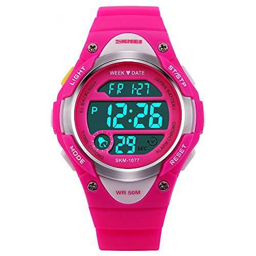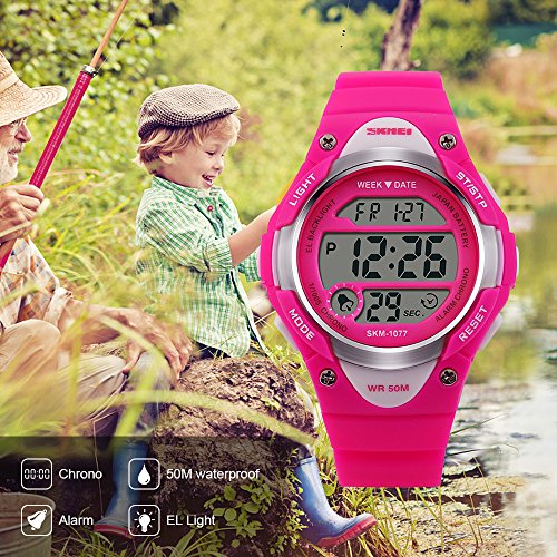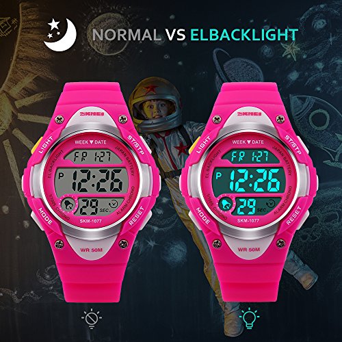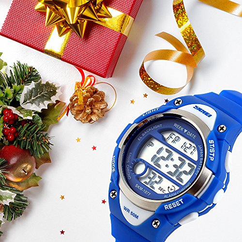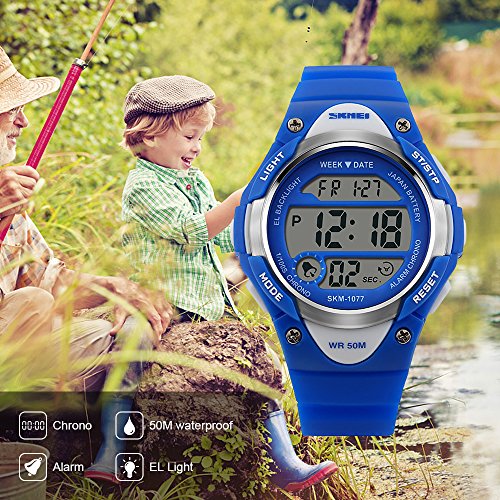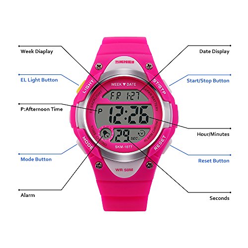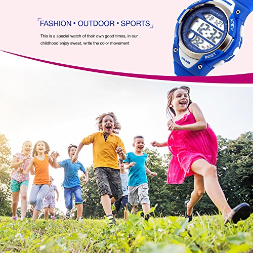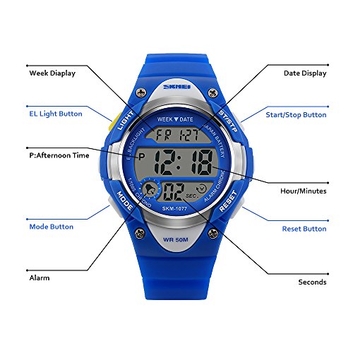 -. Feature : PRECISE TIME KEEPING: Original Movement, provide precise and accurate time keeping for kids. Imported wristwatch battery which can provide the digital watch strong power when children playing sports. / Digital WATCHES: Fashionable sporty dial design for kids ( boys or girls ) , sports style outlook. Large Dial and numbers with light, show time clear in the dark. Use import EL Lamp, Press "LIGHT" button to see the time clearly in the light. / HIGHLY TRANSPARENT RESIN GLASS: The glass is made from the highly clear resin material imported abroad and sealed with the kids watch case by high frequency machine. So that the glass is extremely hard and pressure-tolerant. / Waterproof:The waterproof depth is up to 50M,Suitable for kid to wear the sports Watch when handwashing, showering, swimming. NOTE: Please Don't Press Any Key Underwater. / Warranty: 12 months warranty of quality issue, 3 months hassle -free return & exchange policy.