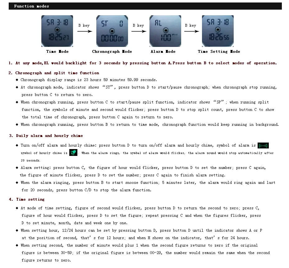 Feature:Chronograph, Alarm, Backlight, Stopwatch