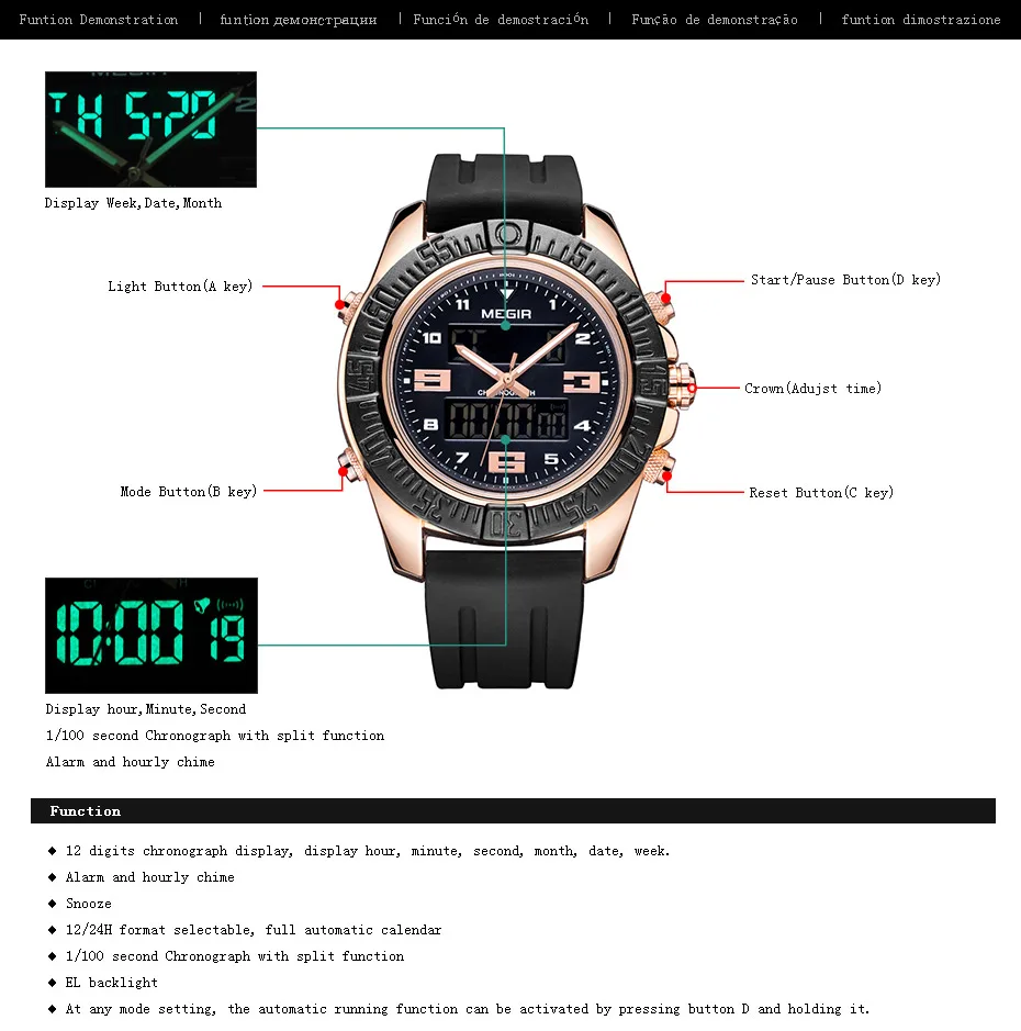 Feature:Water Resistant,LED display,Luminous,Multiple Time Zone,Stop Watch,Back Light,Complete Calendar,Chronograph,Perpetual Calendar,Auto Date,Alarm,Repeater,Moon Phase
