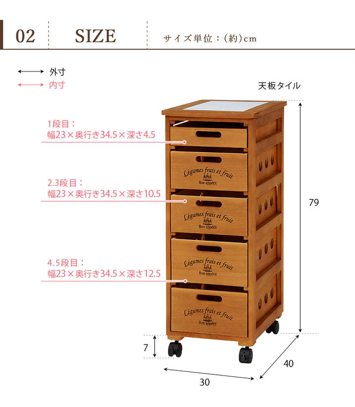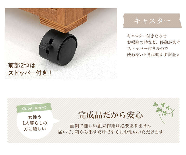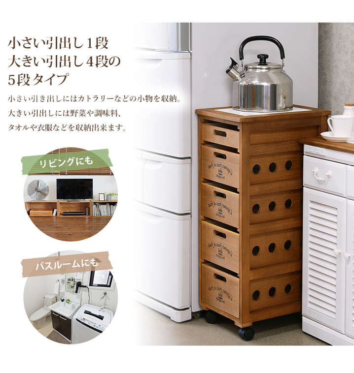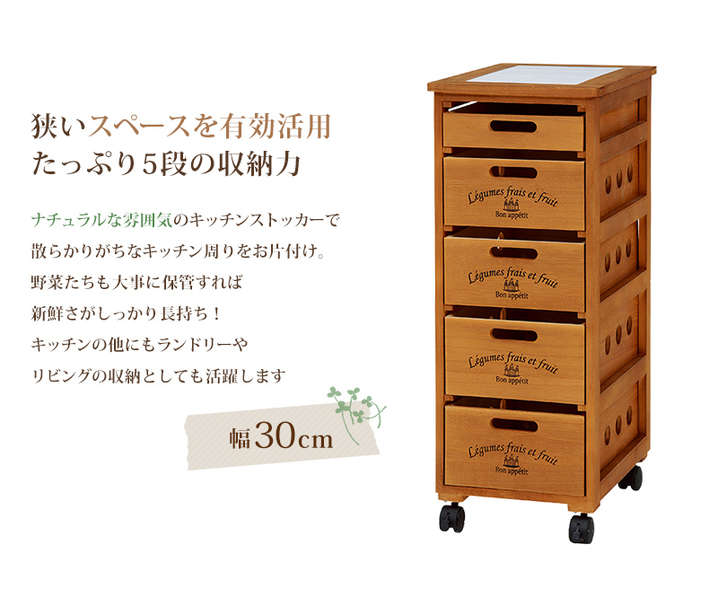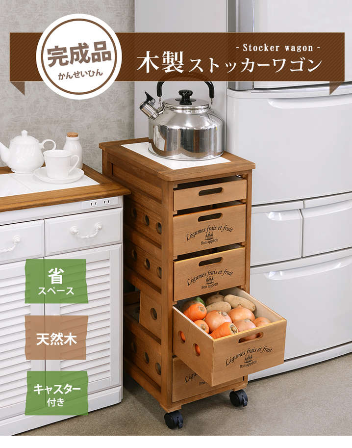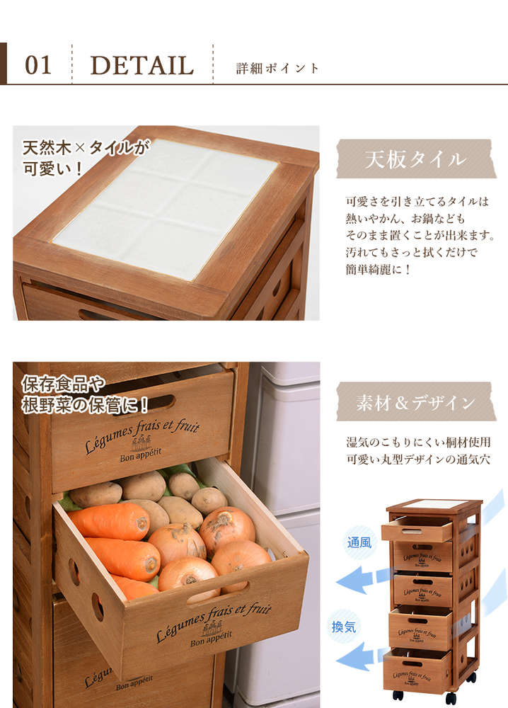 ●キャスター付きでラクラク!通気性のよい木製で野菜ストッカーにピッタリ。タイル天板は熱い鍋などを置くのにも便利。