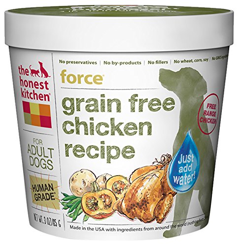 -. Binding : Misc. -. Brand : Honest Kitchen -. EAN : 0853089007343 -. Feature : GRAIN FREE dog food with free-range chicken / MODERATE calories and protein, for adult dogs of all breeds & sizes / MINIMALLY PROCESSED dehydrated whole food ingredients / 100% HUMAN GRADE dog food from farm to bowl / MADE IN THE USA by a family-owned company, nothing from China -. Label : The Honest Kitchen -. Manufacturer : The Honest Kitchen -. Model : FC3T -. MPN : FC3T -. NumberOfItems : 8 -. PackageQuantity : 1 -. PartNumber : FC3T -. ProductGroup : Pet Products -. ProductTypeName : PET_SUPPLIES -. Publisher : The Honest Kitchen -. Size : 3 oz -. Studio : The Honest Kitchen -. Title : The Honest Kitchen FC3T Force: Grain-Free Chicken Dog Food Single Serve Cup, 3 oz -. UPC : 853089007343