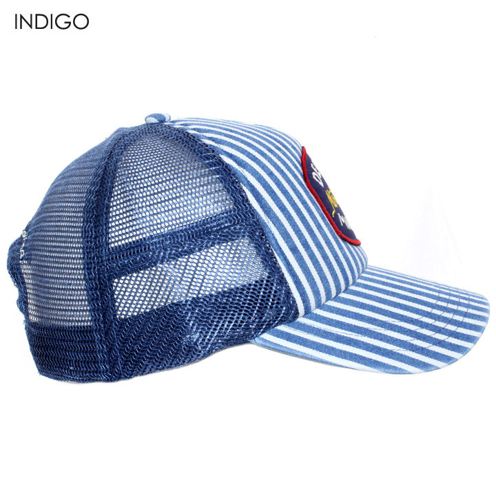爽やかなヒッコリー柄のメッシュキャップ。ガスストアーのキャップを彷彿とさせるロゴワッペンをフロントへダイナミックに配し、ワークウェアとの相性バツグンなデザインが特徴。また、スナップ部分でサイズ調整すれば女性の方でも着用ができるので、ボーイッシュなスタイリングのアクセントアイテムとしてもオススメです。