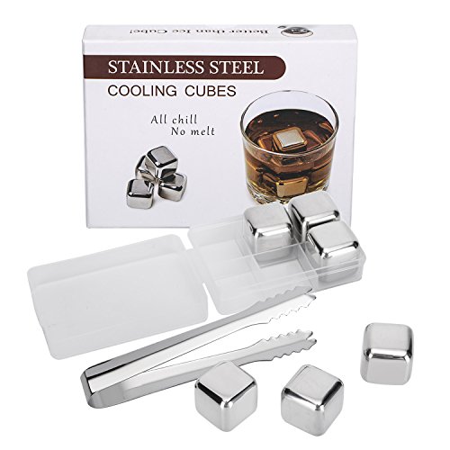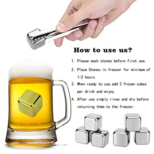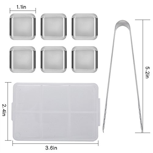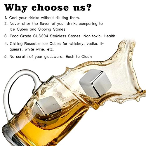 -. Feature : Nice Gift Box Packing Suitable for any Gift Occasion. Food-Graded SUS304 Stain Steel Whiskey Stones is Non-Toxic, Safe and Healthy. / Includes 6 Reusable Stainless Steel Stones and Ice Tongs. Includes Plastic Storage Tray to Keep Your Whiskey Stones Clean. Durable and Reusable, Easy to Wash and Clean. / Our Food-Graded SUS304 Stain Steel Ice Cubes Contains Natural Antibacterial Properties. Never Wears, Rusts or Corrodes. It's different from competitor's soapstone material of whiskey rocks which is fragile and can disintegrate over time. Chill Your Wine, Drinks, Whiskey While Retaining Its Flavor for a Longer Time Without Diluting Them. / Ice Cubes Melt and Water Down the Flavor of Your Drinks. Rock Cubes Alters the Taste of Your Drink with a Soapstone Smell. / Lifetime Warranty & 100% Money Back Grarantee. If you are not absolutely satisfied with your product, we will replace or refund your order, no questions asked.