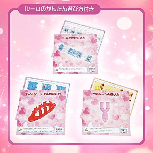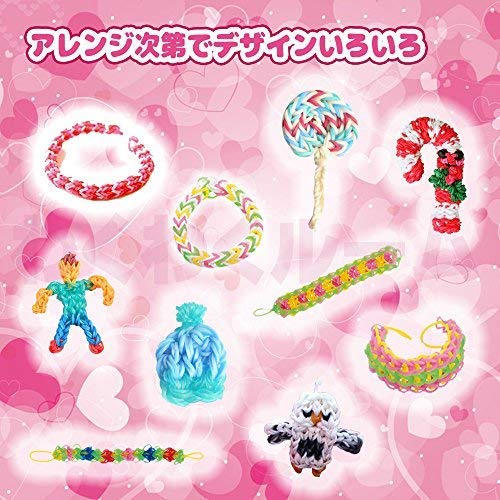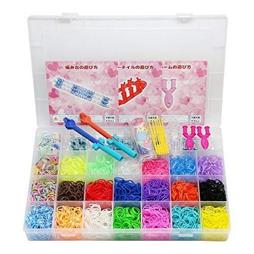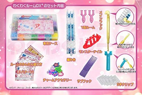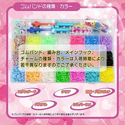 セット内容:ゴムバンド(22色、約4400本入)、メインフック(2本)、編み台(1機)、モンスターテイル(1個)、Y型ルーム(2個)、ルームのかんたん遊び方(日本語)、ミニフック(5~6本)、S字クリップ(5~6パック)、チャームアクセサリー(ランダム)、専用収納ケース